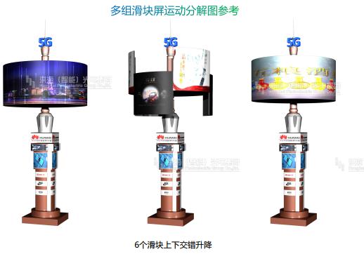 多組滑塊升降屏可以360度旋轉,一共6個LED模組屏,每個模組屏可以獨立播放視頻,上下錯落的自由升降,也可以合并成一塊圓柱大屏,變化多樣用途廣泛,成為獨特搶眼的地標。